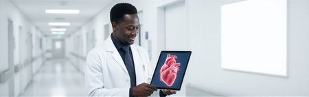African male doctor showing heart illustration on tablet in hospital corridor. That the image is generated using AI.