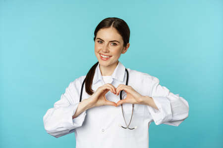 Young doctor, woman physician showing heart, love sign and smiling, care for patients in clinic, standing in white coat over blue background