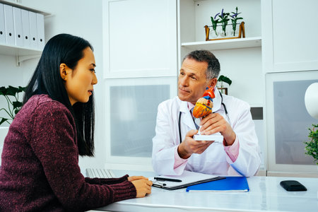 friendly doctor showing human heart mockup to his female patient during examination visit