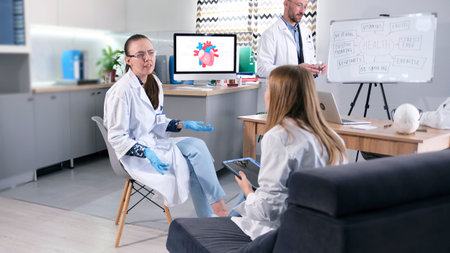 Three medical staff analyze detailed heart scans using high-tech monitors in a clinical setting.