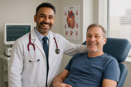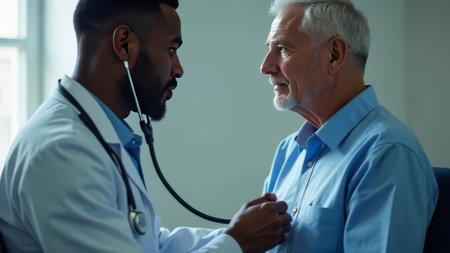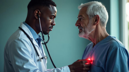 African American doctor attentively listens to an elderly man heartbeat with stethoscope during check-up, symbolizing trust and professional care. Two men in hospital. Cardiology diagnostic