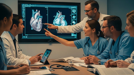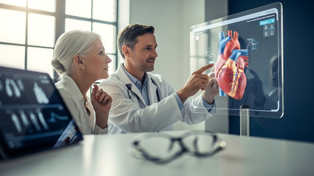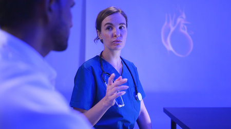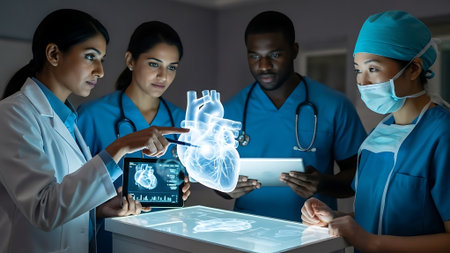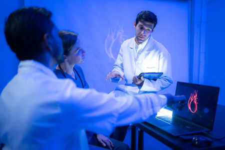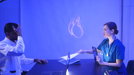 Doctors and medical professionals discussing heart health with futuristic hologram technology in a modern hospital setting