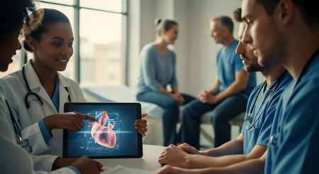 A female doctor in a white coat holds a digital tablet displaying a heart diagram, discussing with colleagues in blue scrubs, while patients sit in the background, in a bright medical setting.