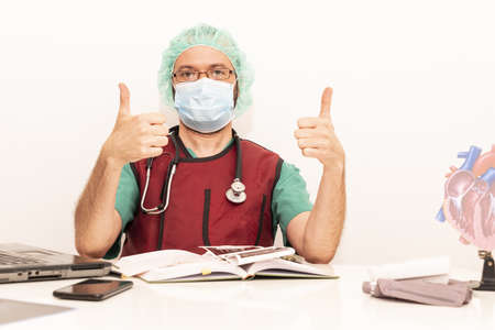 Cardiologist doctor working in his office wearing an operating theater suit and lead x-ray protective equipment, white background.