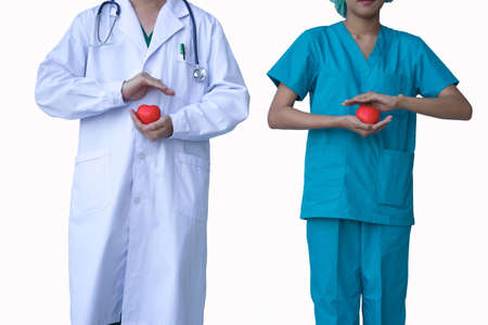 Male doctor in white doctor suite with woman doctor in surgical dresses holding decorative heart on white background.