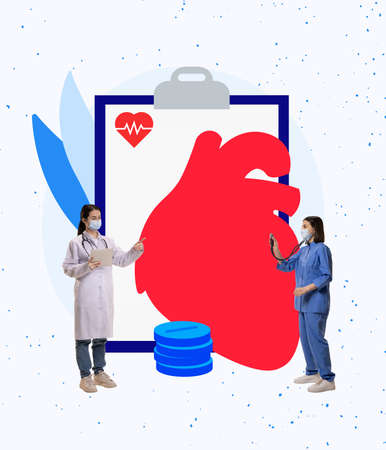 Contemporary creative art collage. Female doctor and assistant isolated on drawn red heat background. Concept of pharmacy, medicine, healthcare