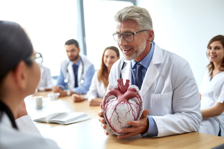A smiling male cardiologist holds a heart model while giving a lecture to medical students