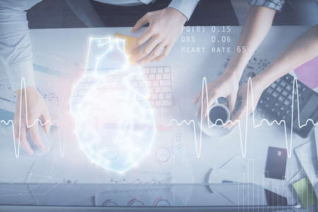 Double exposure of man and woman working together and heart hologram drawing. Computer background. Top View.