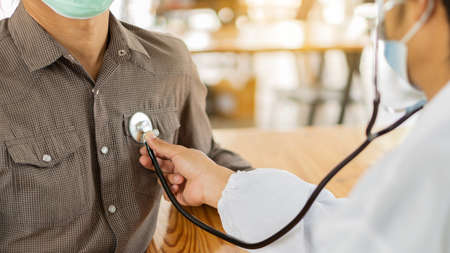 Doctors are using a stethoscope to examine the patient's heartbeat, physical examination and health care to keep up with the disease so that it can be treated promptly. Concept of physical examination