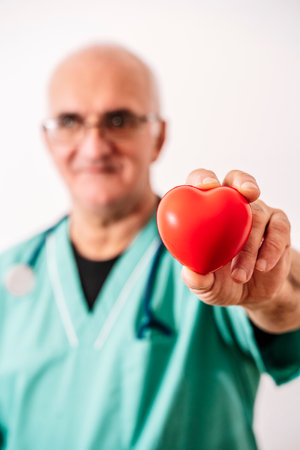 Close up of the hands of a caucasian cardiologist specialist holding a red heart heart. Promoting prevention of heart problems