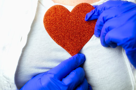 Cardiologist diagnostic of heart with hands in medical gloves, top view