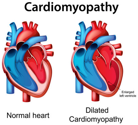 Vector illustration showing a normal heart and one with dilated cardiomyopathy, highlighting anatomical differences and enlarged left ventricle