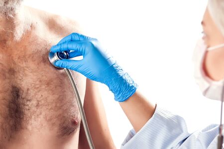 A medic and a resident medic check the health of a senior man senior male patient with a stethoscope.