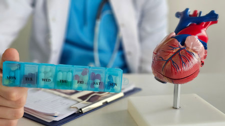 Doctor demonstrating medication with pill organizer and heart model during a patient consultation