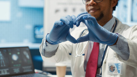 African american medic putting on his rubber gloves and showing heart shape sign in cabinet, emphasizing patient care and professional healthcare services. Doctor at check up. Camera A.