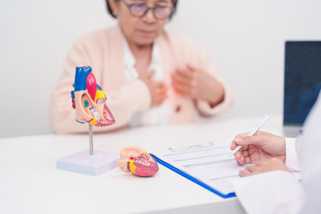 General practitioner holding tablet with heart condition and cardiology illustration at consultation with old patient. Doctor explaining cardiovascular system and diagnosis to elder woman.