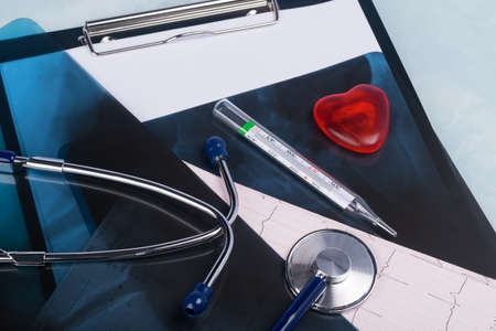 against a background of a clean notebook, for recording the results of a patient examination, a thermometer, a phonoscope, a cardiogram and a picture of a person's lungs, with suspected coronavirus, close-up