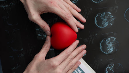 Cardiologist diagnostic of heart with hands in medical gloves, top view