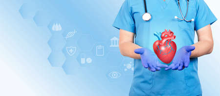 Cardiologist with a stethoscope with a symbol, supports a realistic red heart as a symbol of the prevention and treatment of cardiovascular diseases. Copy space. High quality photo