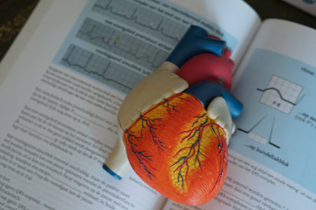 This image captures a close-up of an anatomically correct model of a human heart in a medical setting.