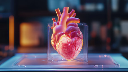 Realistic model of a human heart, placed in a futuristic lab setting