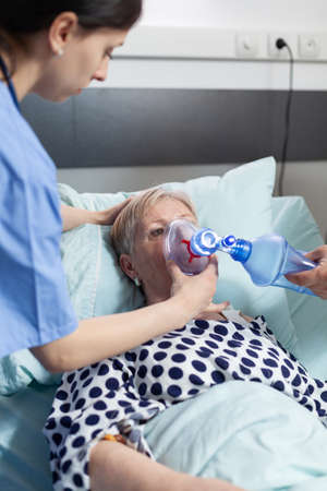 Doctor and nurse helping sick hospitalized senior woman breath, with ambu bag during resustacitor process, due to lung infection, iv drip bag attached. Cardiopulmonary resuscitation process.