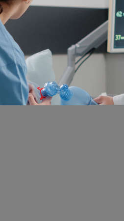 Above view of nurse in surgical gloves using Ambu bag for ventilation to ill mature patient