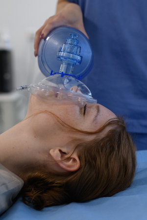 Anesthesiologist making ingalation anesthesia for patient. Doctor puts a mask on the patient before starting operation.