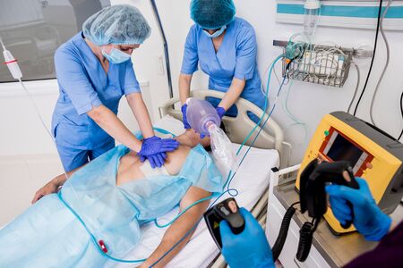 Doctors give resuscitation to a male patient in the emergency room. Cardiac massage. Defibrillation