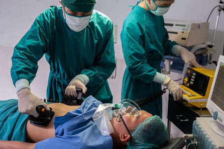 Doctor and nurse using defibrillator to pump at chest of unconscious with low heart rate patient to save life while doing medical surgery inside of operating room. Emergency aid, CPR.