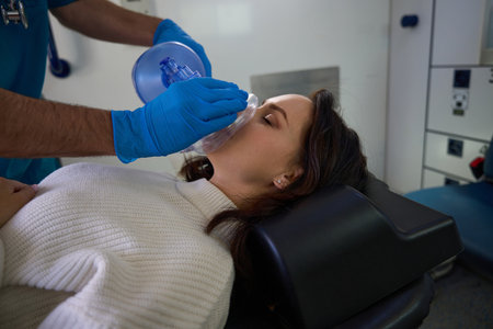 Rescuer using oxygen mask to help young woman
