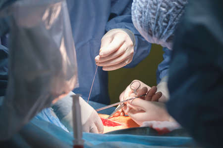 Doctors use medical instruments and metal thread to suture human skin during minimally invasive surgery. Close-up of hands in sterile gloves, covered with blood. Blue uniform and medical masks.