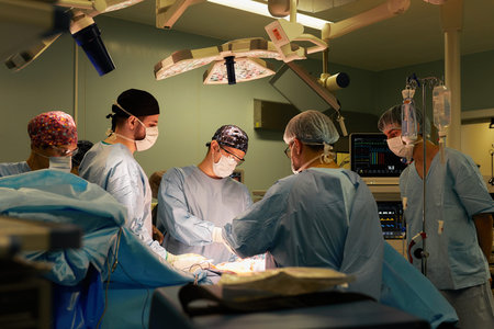 An international team of doctors performs a complex surgical operation on a patient under anesthesia. Modern operating room and experienced surgeons save lives.