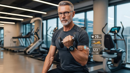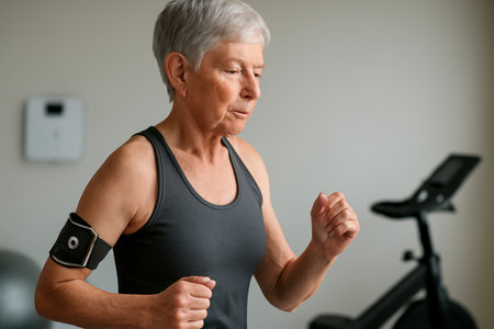 AI generated elderly woman in a home gym using smart devices to monitor health metrics during exercise. Fitness tracker on arm displays health data, modern gym equipment in background.
