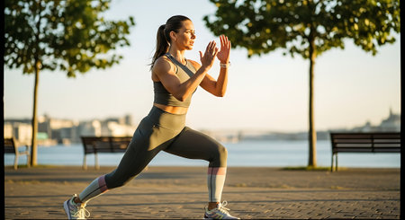 A woman performing lunges outdoors in a park near a body of water during sunset.
