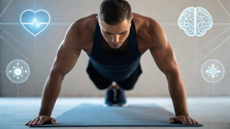 A fitness enthusiast wearing an ECG-equipped smartwatch during a workout, with the monitor displaying heart rate data, promoting health technology.