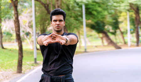 Active Asian young man making an outdoor body weight exercise close up, sportsman doing body weight workout by pushup and plank. Asian sportsman exercising for muscle and body building.