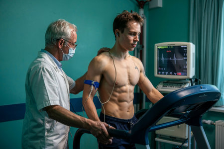 A middle-aged man is undergoing a medical stress test on a treadmill, connected to ECG electrodes for heart monitoring in a clinical environment