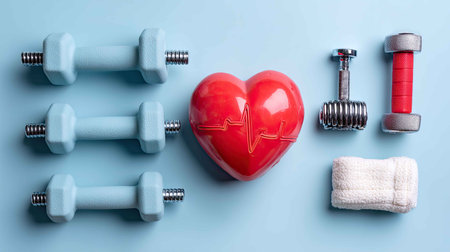 This vibrant arrangement features colorful dumbbells alongside a heart symbol, representing a commitment to fitness and heart health. Perfect for wellness themes.