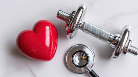 This image illustrates a fitness theme combining a red heart, weights, and a stethoscope, symbolizing the connection between health, exercise, and wellbeing.