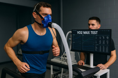 Doctor monitoring a sportsman running on a treadmill while wearing a mask during a VO2 max test in a clinical setting
