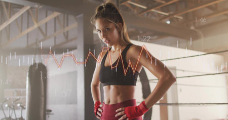 Standing female athlete flexing in gym punching bag wearing red hand wraps showing metrics overlay. Fitness, strength, determination, training, competition, endurance