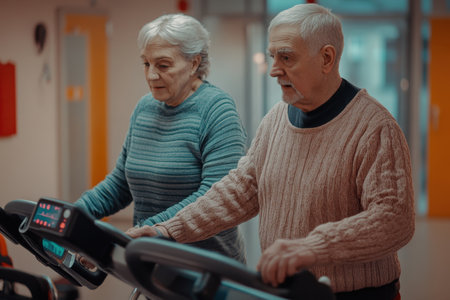 Two seniors are walking on treadmills in a fitness center, engaging in healthy physical activity together.