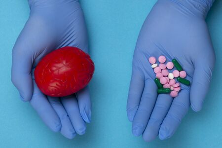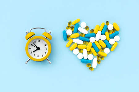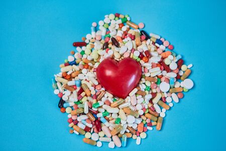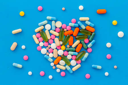 Pile of various drugs medicine arranged in a shape of heart. Blue wood on the background.