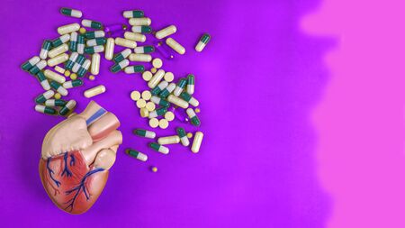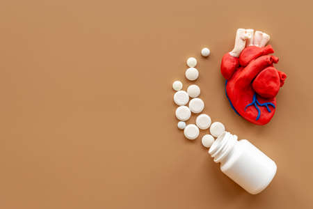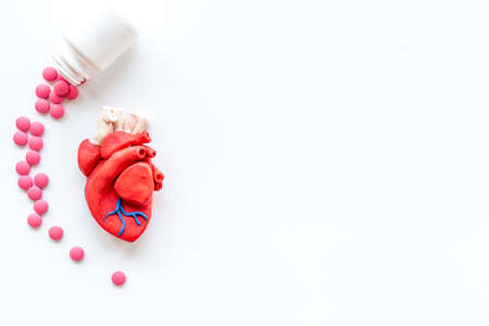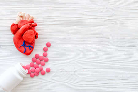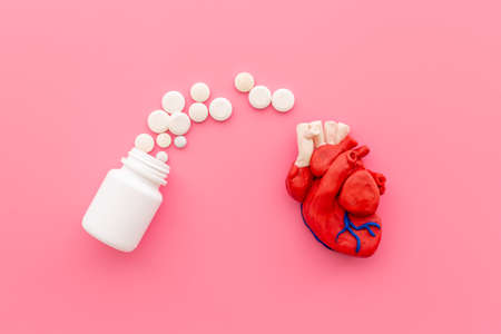 Anatomical plastiline heart with pills. Cardioigy disease treatment