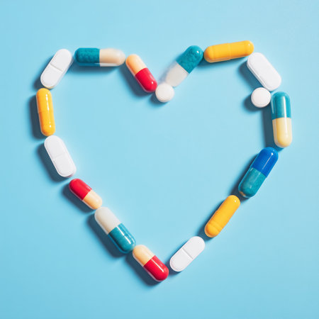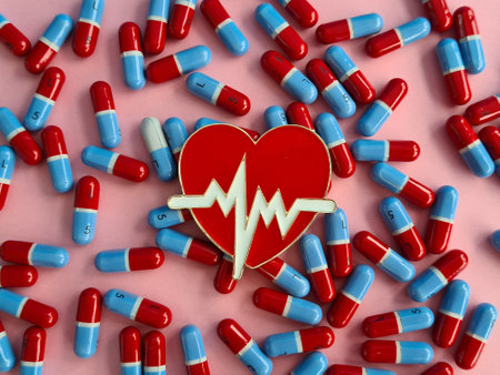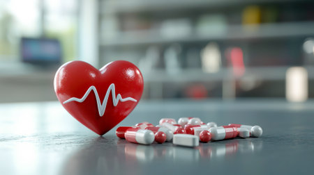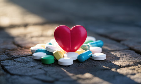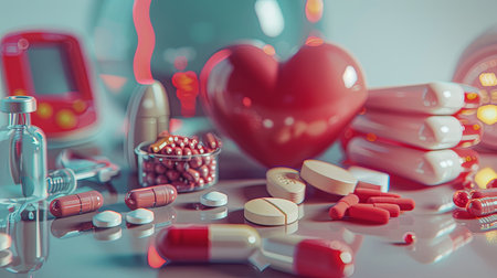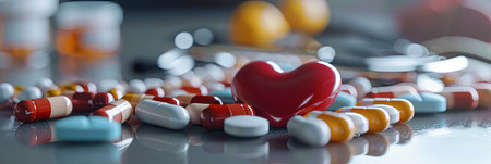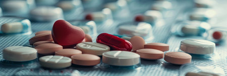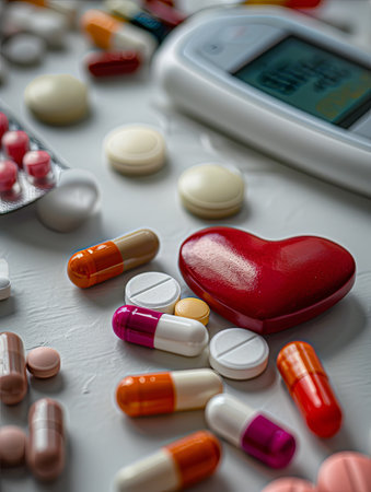 A close-up view of various heart medications, including pills, capsules, and a heart-shaped object.