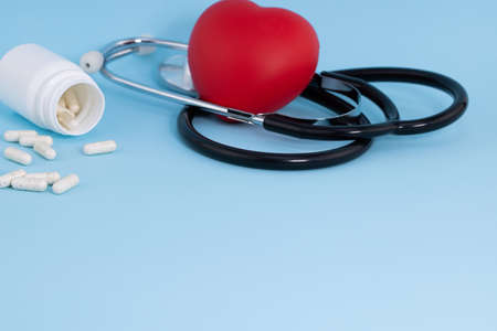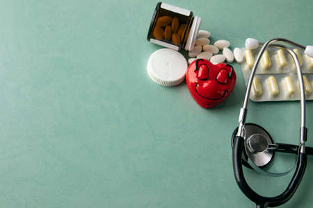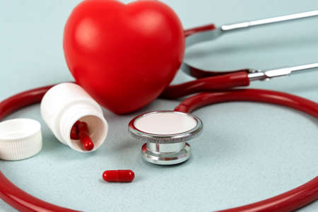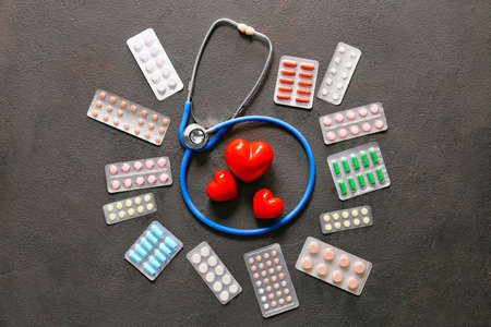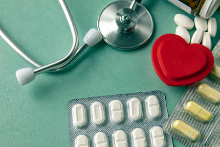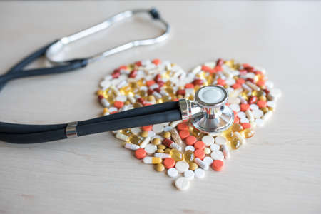 Medical preparations for the treatment of heart diseases. The concept of heart health dependence on tablets. Pills and stethoscope on wooden background.