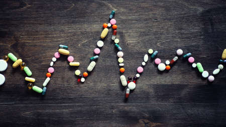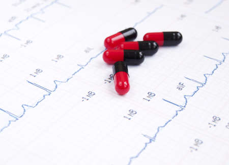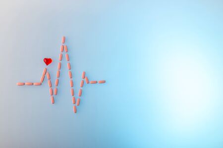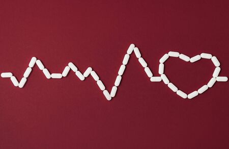 A pile of red pills in a shape of heart on cardiogram. Medical concept.
