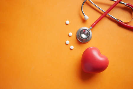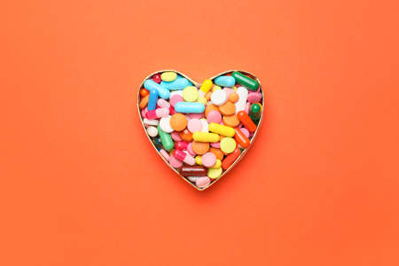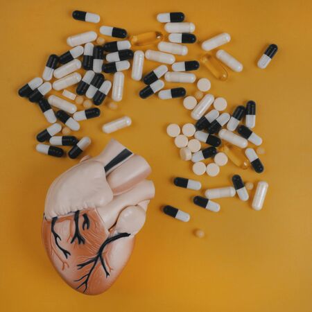Different pills with heart figure on an orange background, the concept of medical prevention heart attacks. Cardiologists advise how to treat your heart to be healthy.