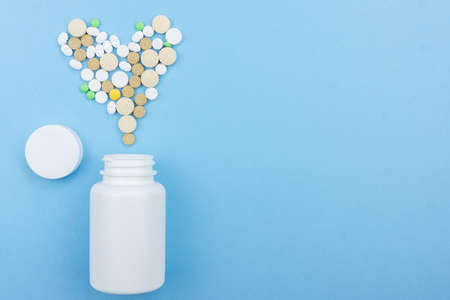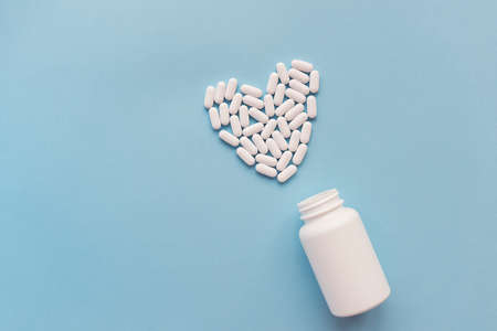 White pills in the shape of a heart and a white jar on a blue background. Pills for heart health. The concept of medicine and health care